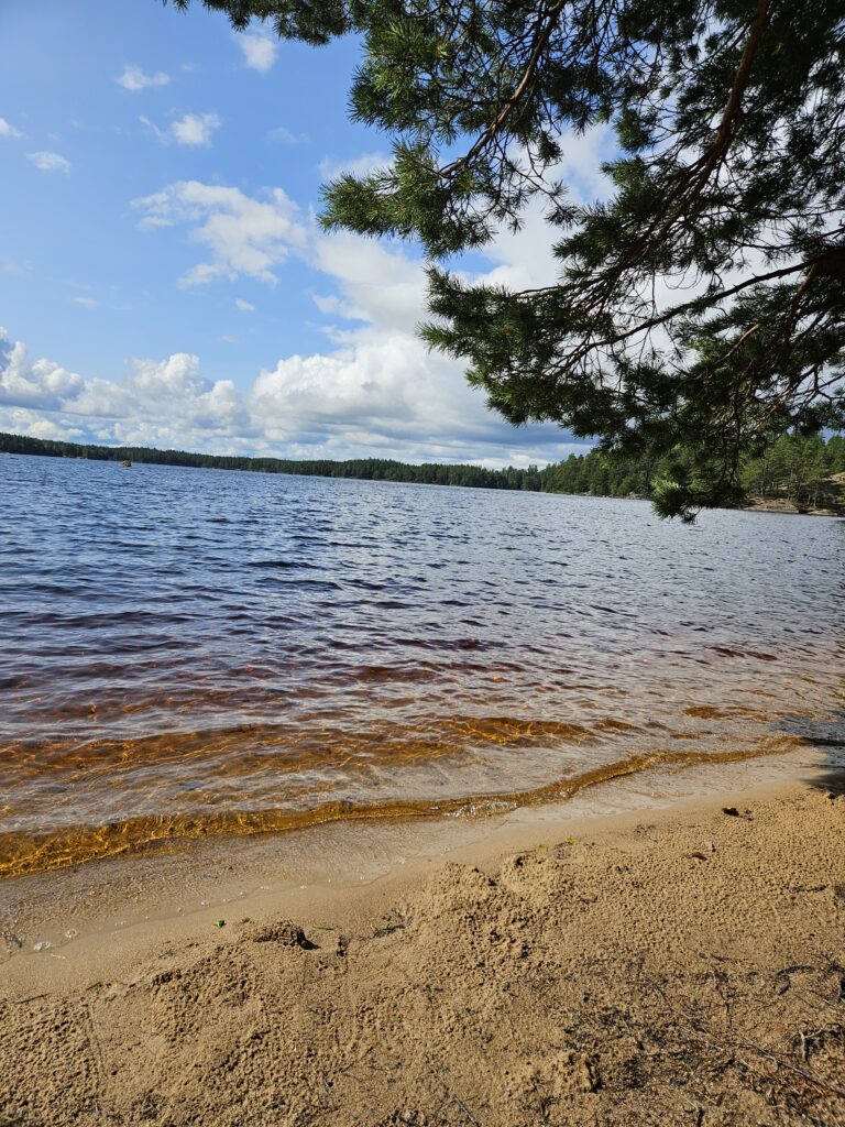 Randonnée “Trehörningsrundan” (tour du lac St Trehörningen) dans le parc national. L’eau est très propre bien qu’elle ait des reflets teintés de rouge, brun ou noir selon la lumière; cet effet vient du humus.